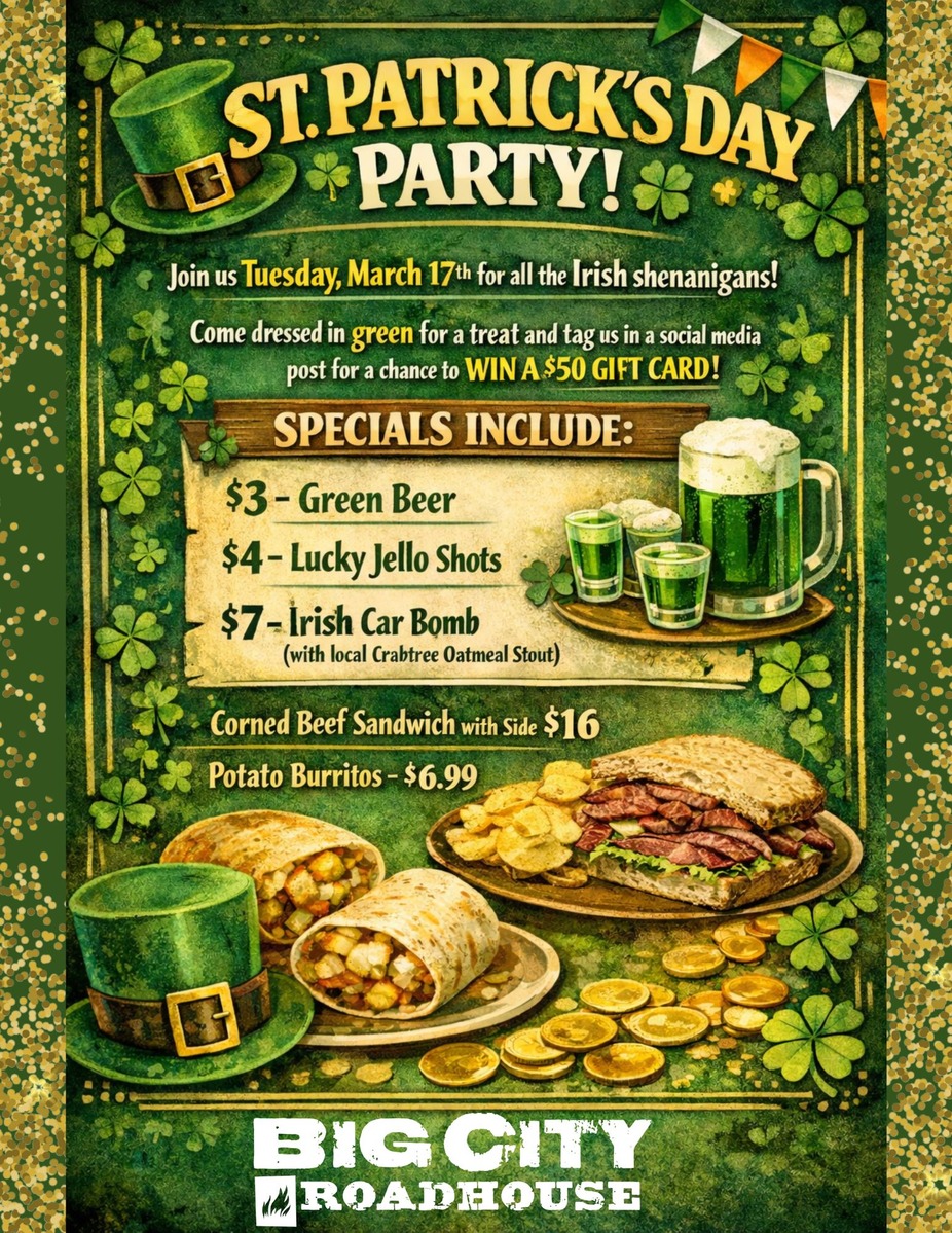 Drink & Food Specials: 🍺 $3 Green Beer 🍀 $4 Lucky Jello Shots ☘️ $7 Irish Car Bomb (with Crabtree Oatmeal Stout) 🥪 Corned Beef Sandwich with Side – $16 🌯 Potato Burritos – $6.99 (add corned beef +$4)